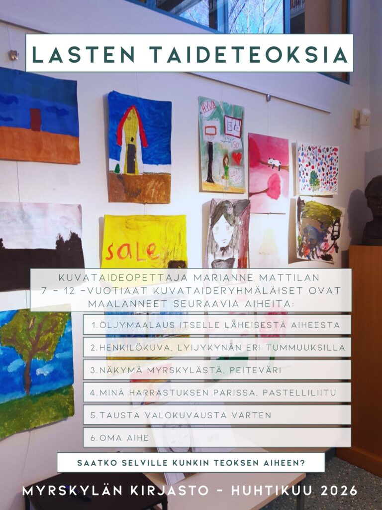 Marianne Mattilan 7 – 12 -vuotiaiden kuvataideryhmäläisten teoksia esillä Kirjaston Galleriaseinällä huhtikuun ajan. Nyt onkin mielenkiintoista katseltavaa! Lapset ovat maalanneet teoksia seuraavien aiheiden mukaan: