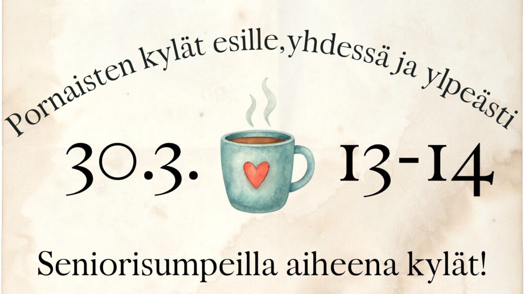 Pornaisten kylät esiin, yhdessä ja ylpeästi! Tervetuloa seuraavaan Seniorisumppiin, aiheena ovat: