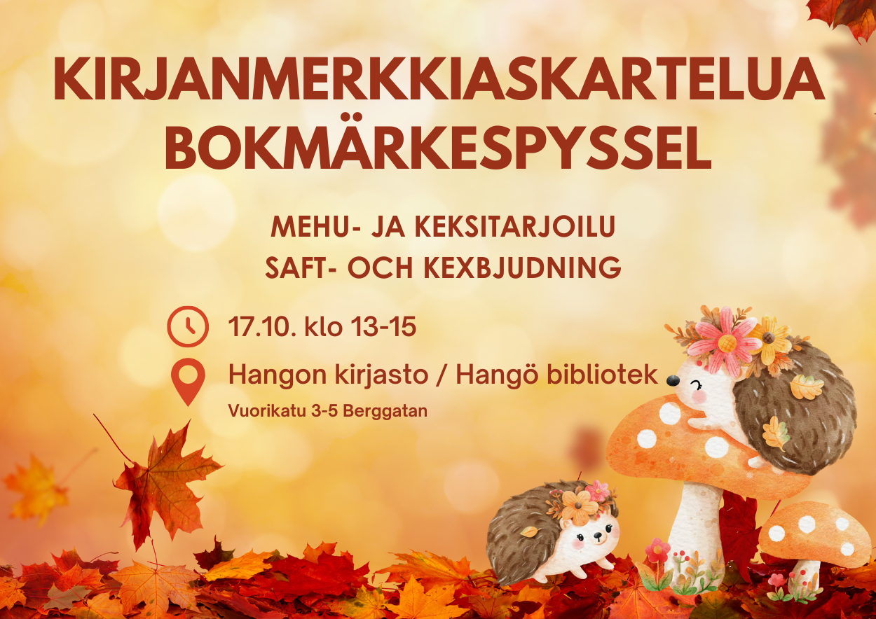 Kirjanmerkkiaskartelua Hangon kirjastossa 17.10. klo 13-15. Mehu- ja keksitarjoilu. Bokmärkespyssel i Hangö bibliotek 17.10 kl. 13-15. Saft- och kexbjudning.